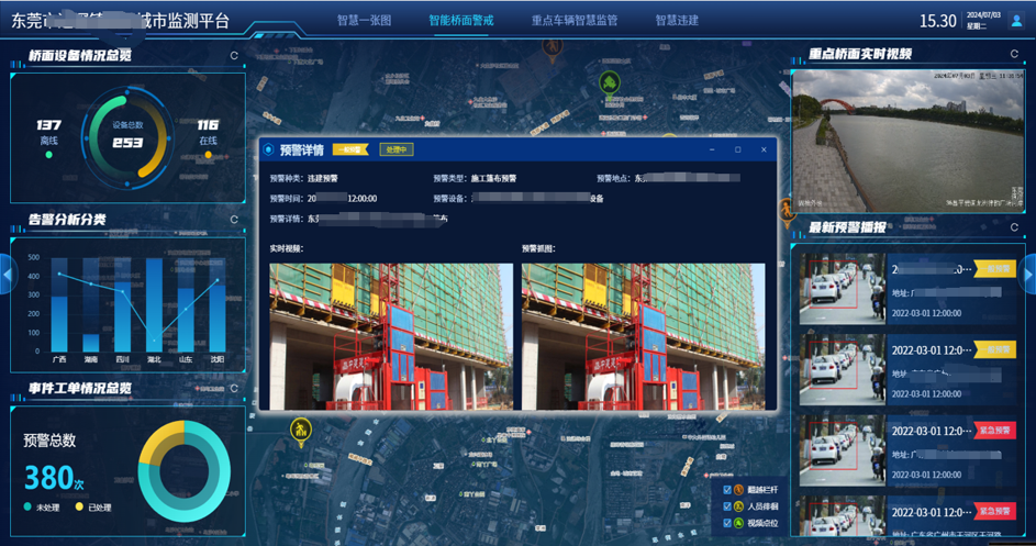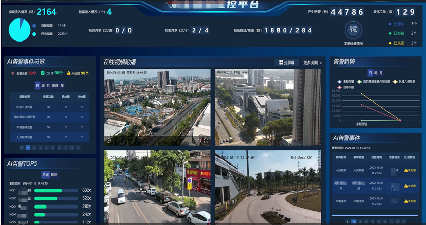 集成了人工智能技术及视频监控能,可接入智慧城市海量视频监控数据,通过视频安全加密技术实现端到端的视频安全传输,再输出至AI中台进行预警分析,根据行业需求进行多算法编排,输出告警工单流转到智慧城市市场监督、城管、教育、交通、消防、应急、水利等部门进行及时处理。